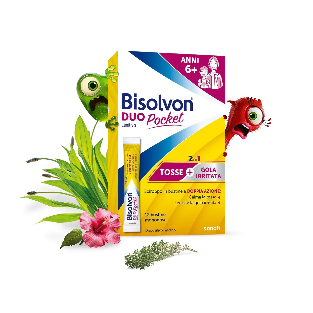 Contro tosse secca, grassa Bisolvon Duo Pocket Lenitivo offre un pratico rimedio in bustine, che puoi portare con te anche fuori casa!