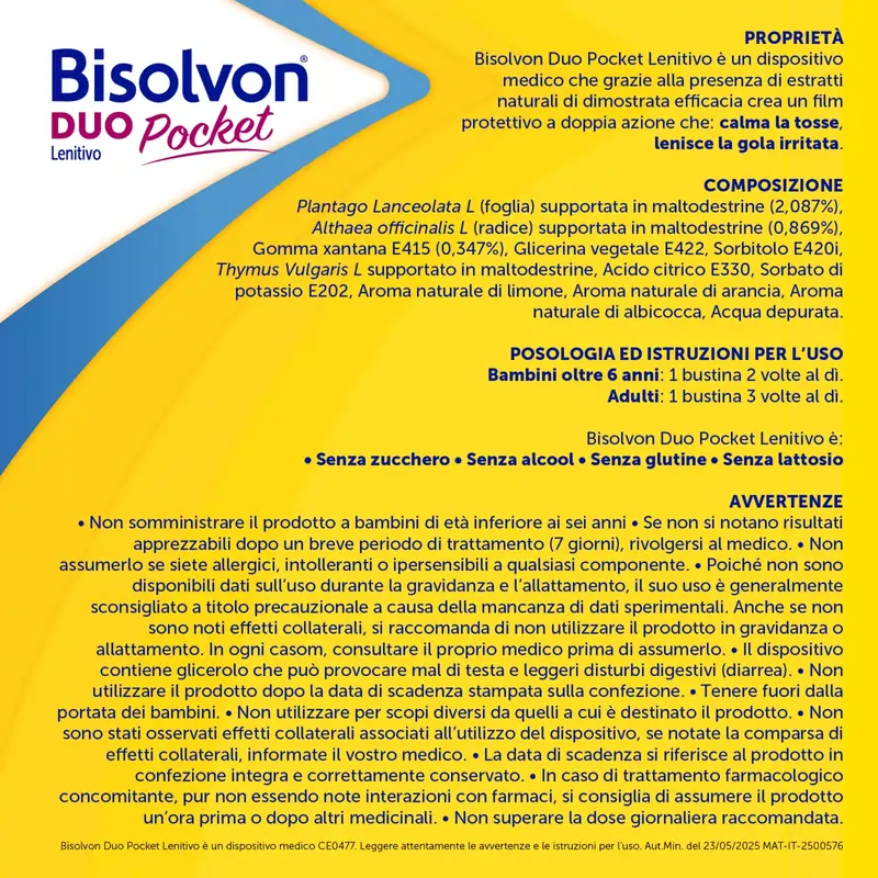 Bisolvon Duo Pocket Lenitivo è un dispositivo medico CE0477.