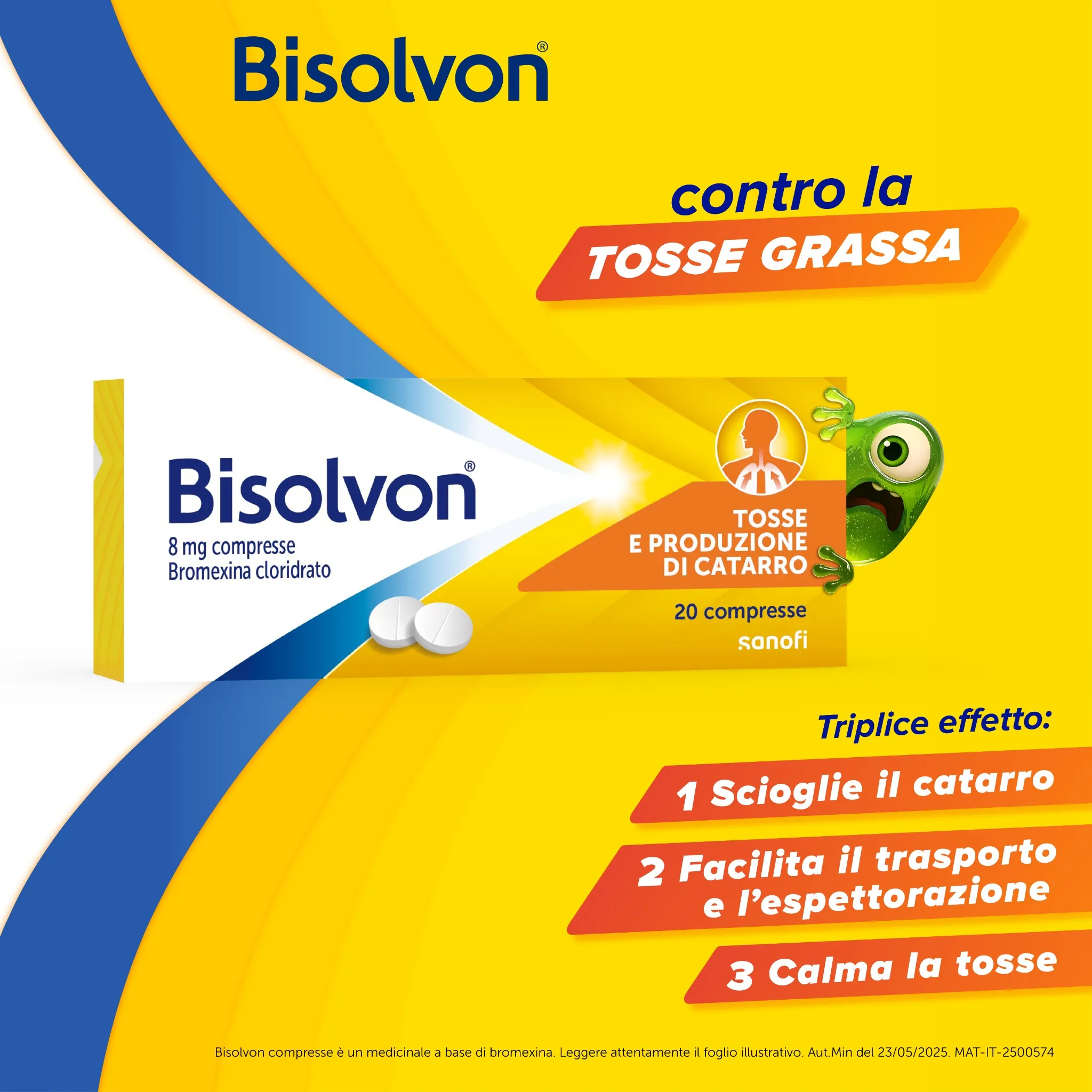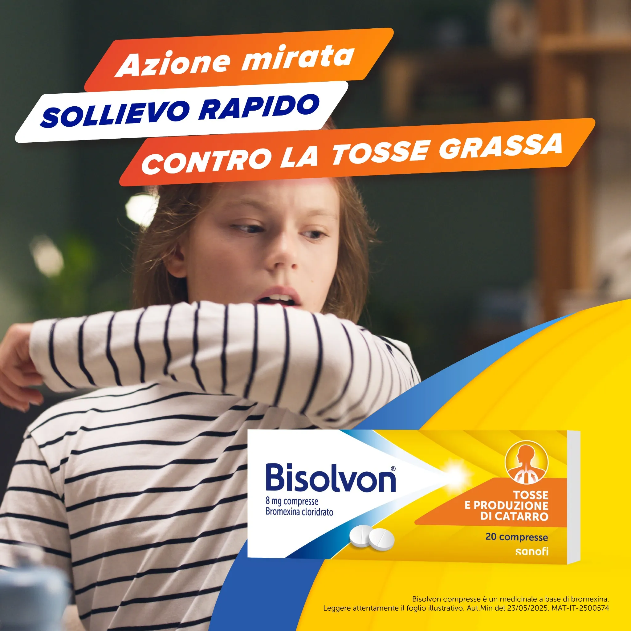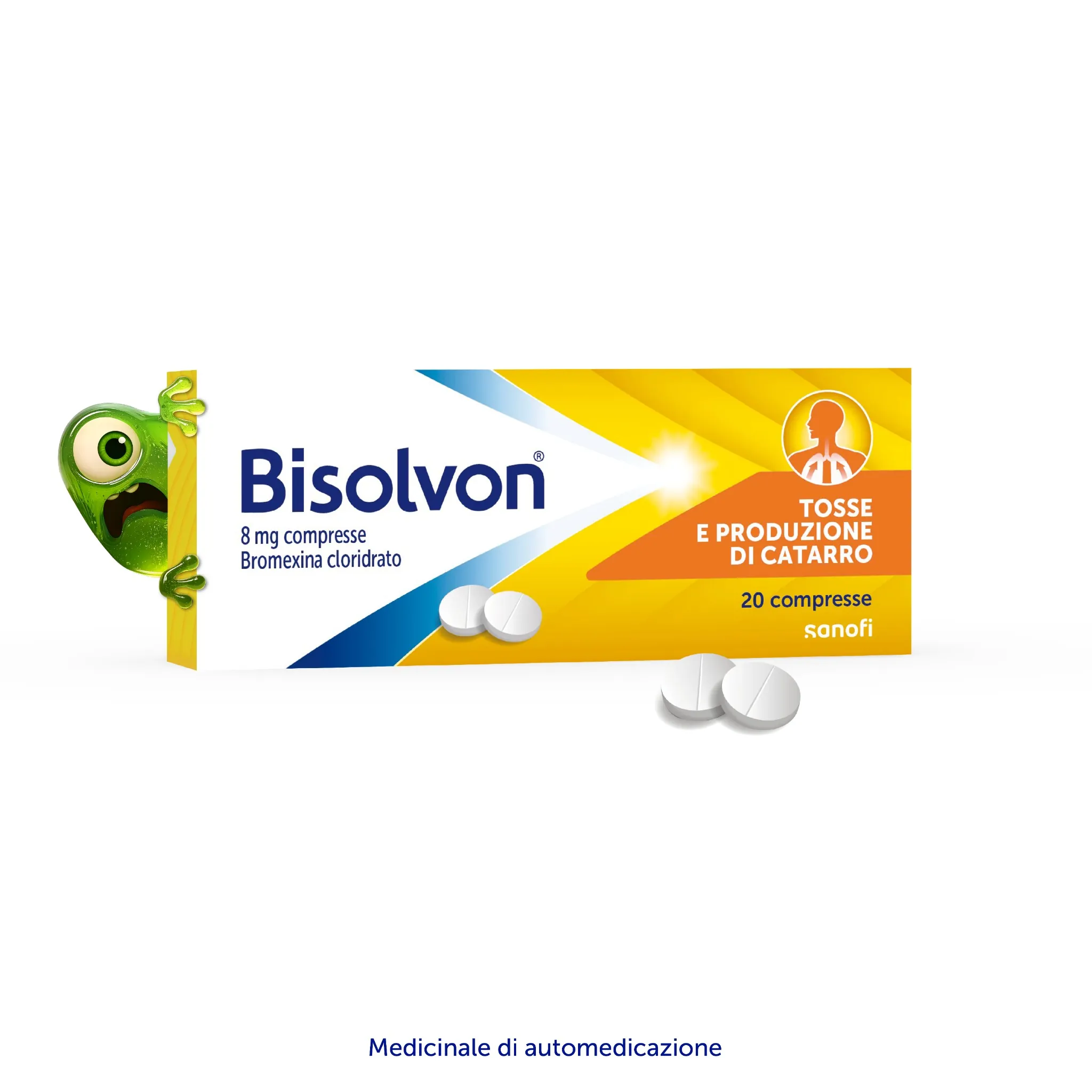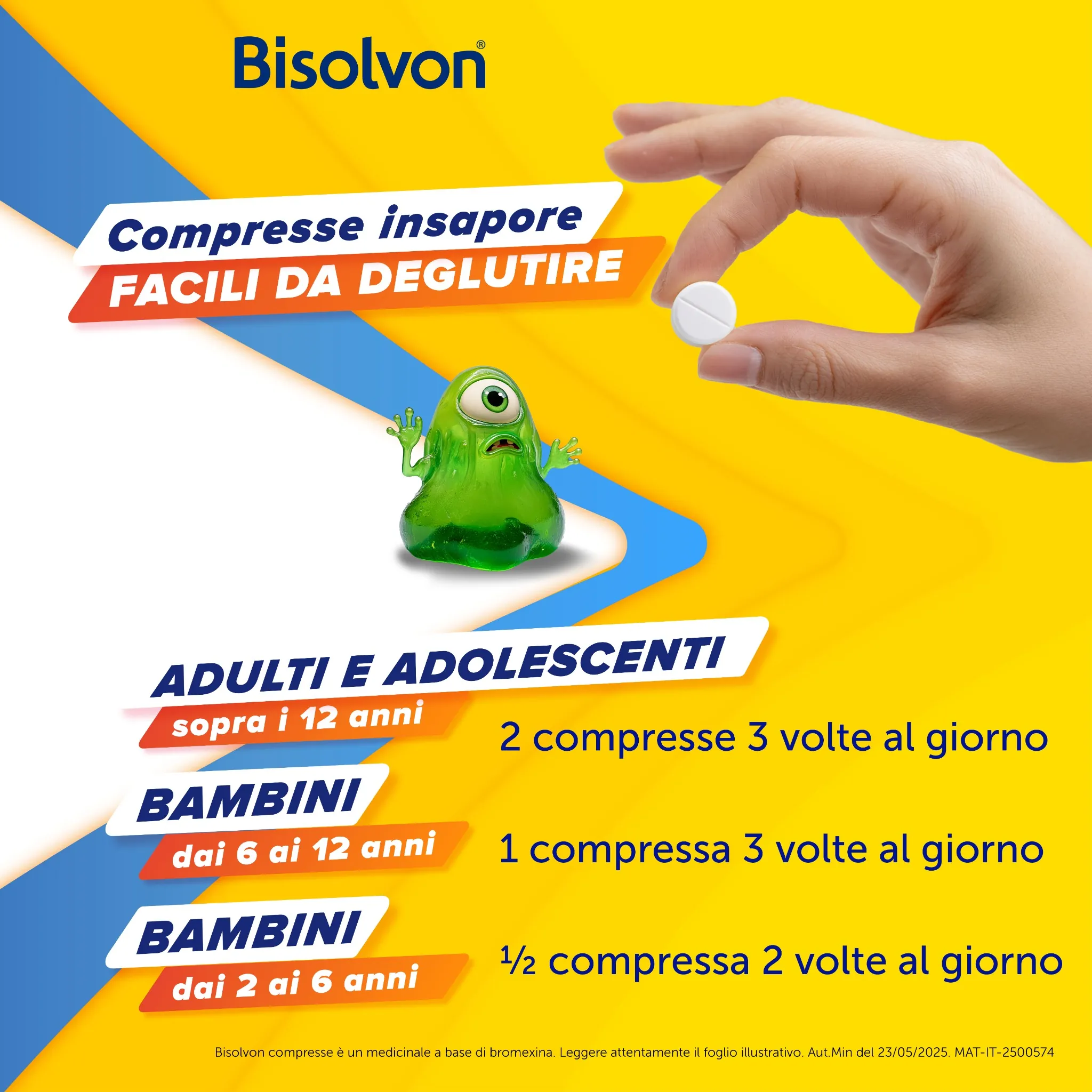 Bisolvon® Compresse è un mucolitico a base di Bromexina che aiuta l’organismo a eliminare il catarro, rendendolo più fluido e quindi più facile da espellere.