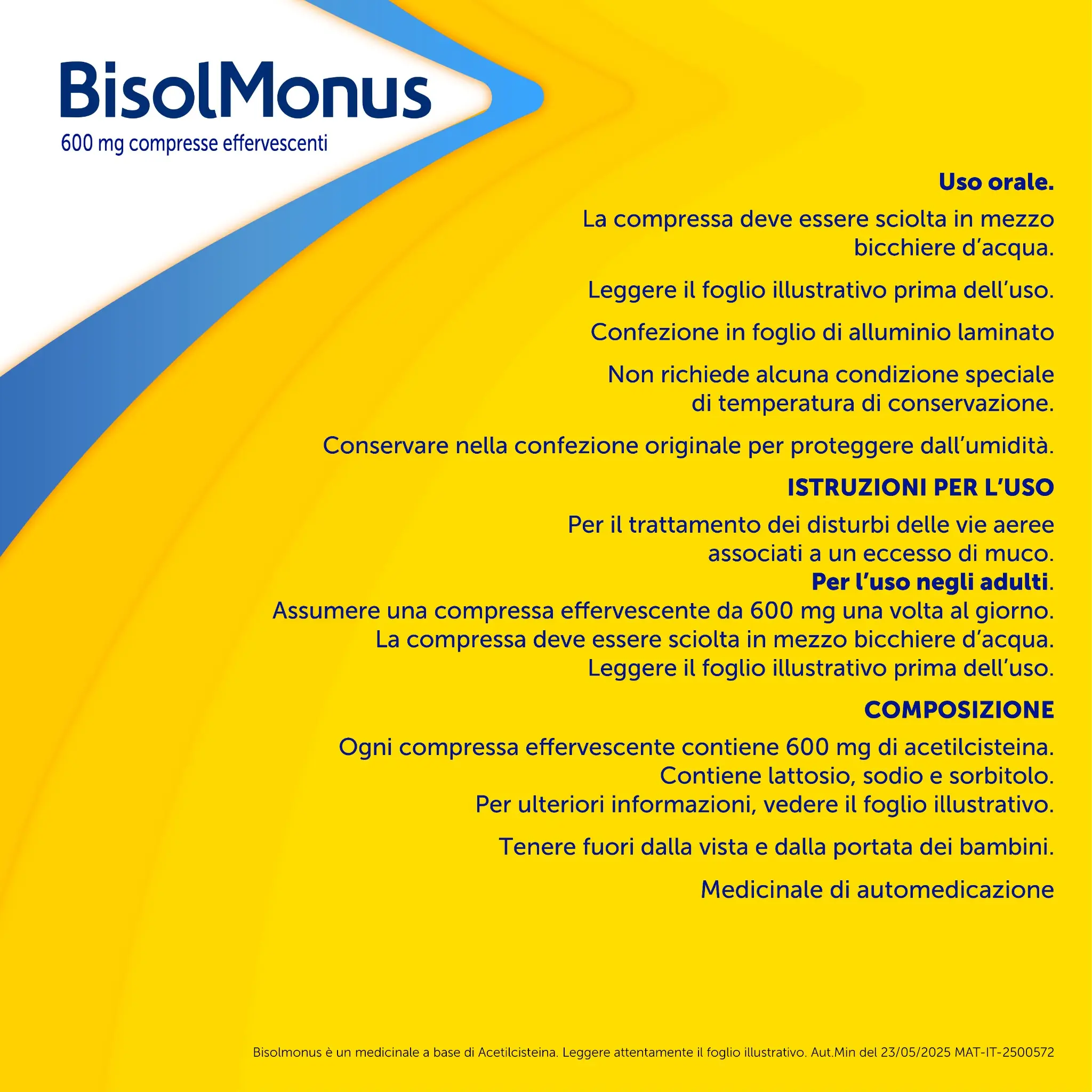 Il principio attivo di Bisolmonus è l’acetilcisteina che, agendo rapidamente come mucolitico, scompone e fluidifica il muco denso, rendendolo più facile da espellere.