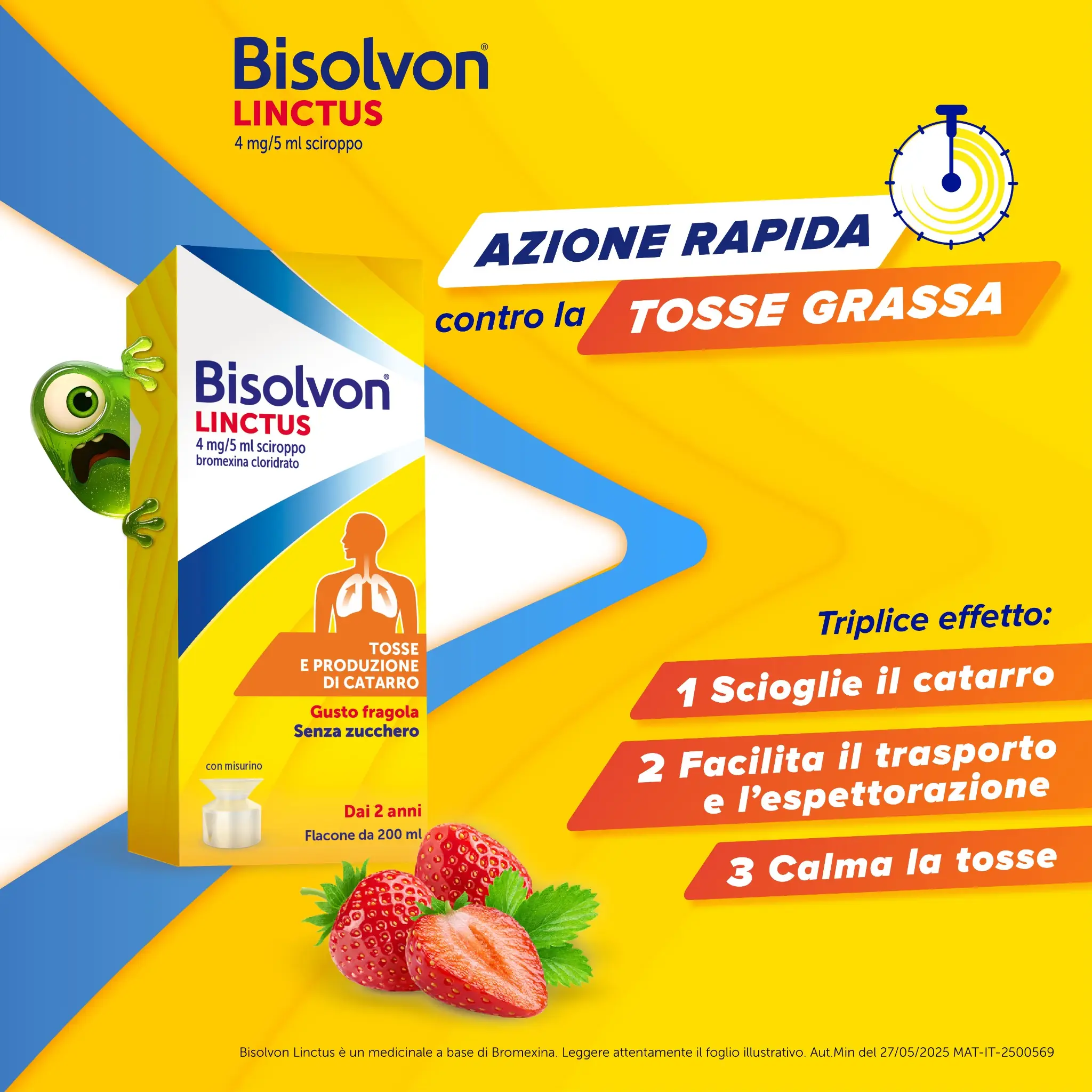 Il principio attivo di Bisolvon Linctus, la Bromexina, ha 3 azioni: scioglie il catarro, ne facilita l’eliminazione, aiutando a liberare le vie aeree.
