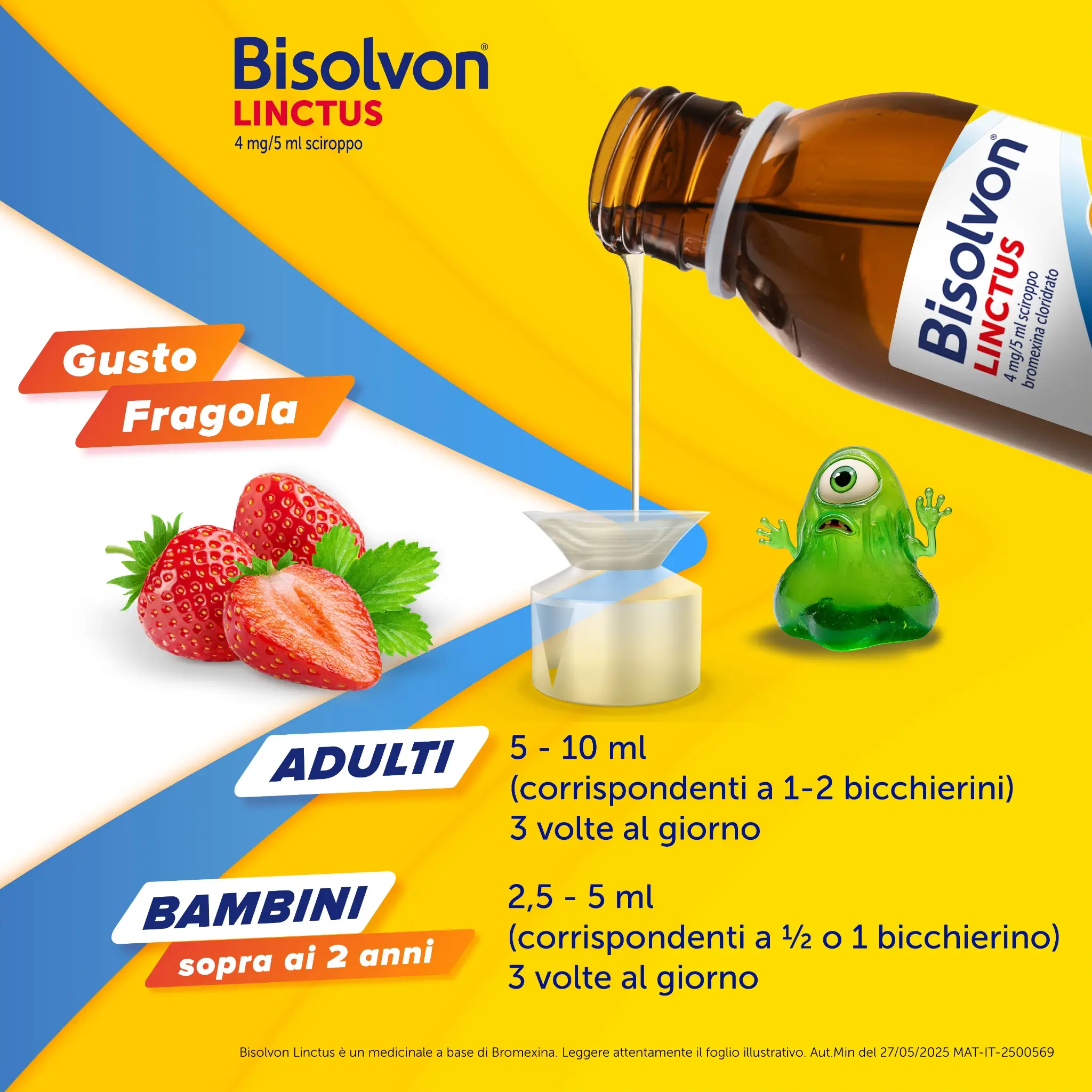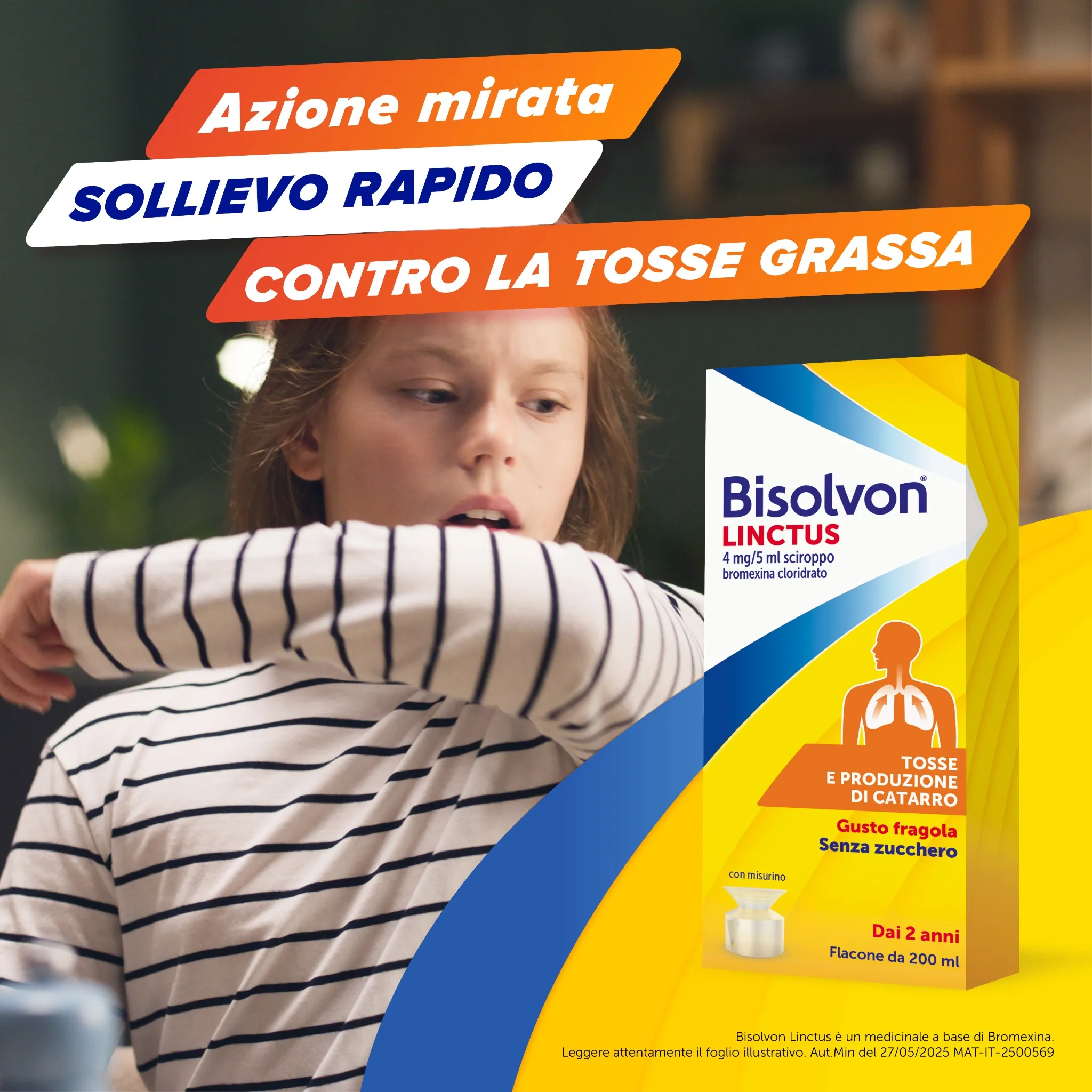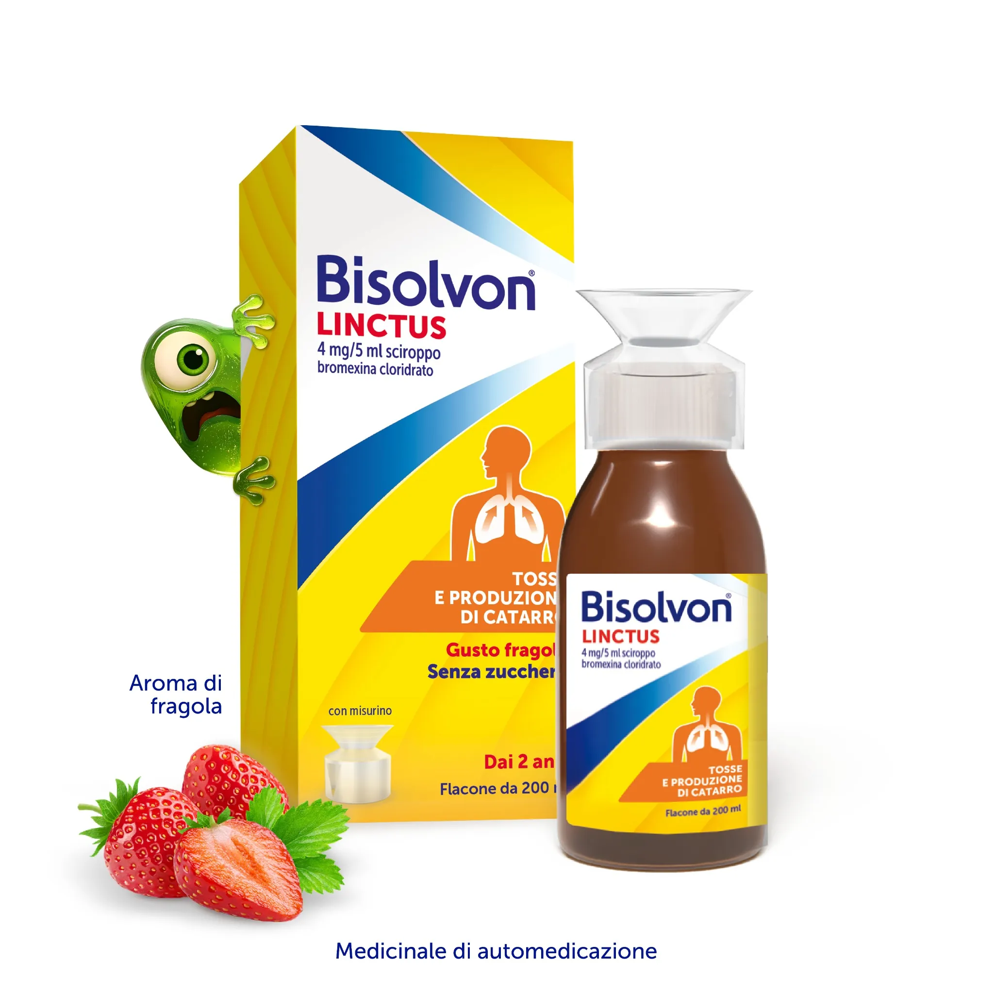 Se la tosse con catarro ti infastidisce, puoi provare Bisolvon® Linctus Sciroppo (gusto fragola), che viene rapidamente e completamente assorbito e si concentra a livello del tessuto bronchiale e polmonare, dove è presente il catarro.
