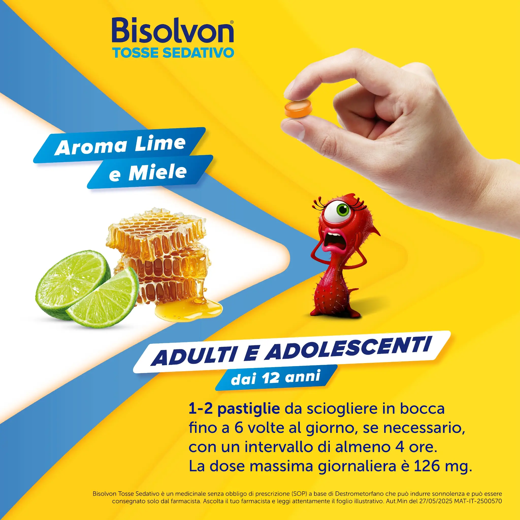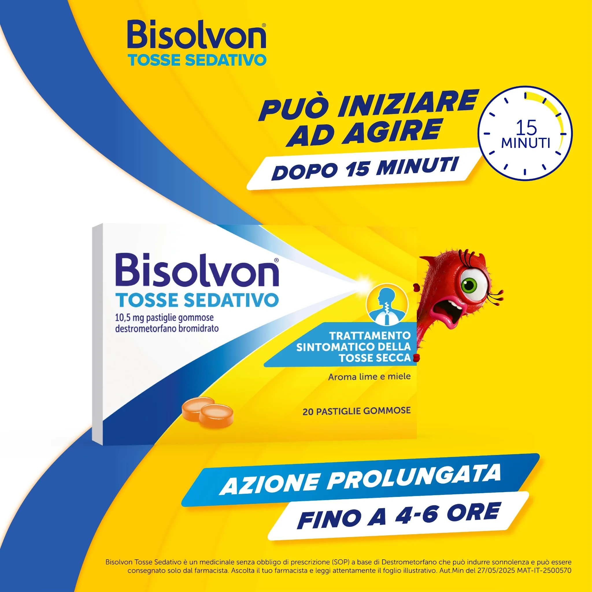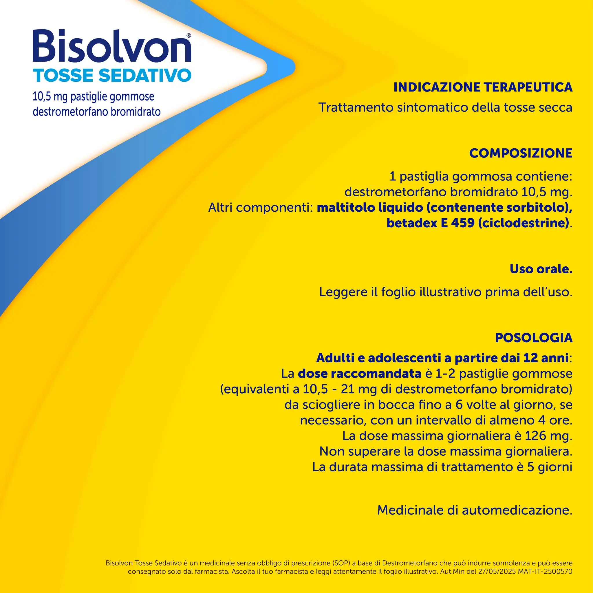 Bisolvon Tosse Sedativo è un medicinale senza obbligo di prescrizione (SOP) a base di Destrometorfano che può indurre sonnolenza e può essere consegnato solo dal farmacista. Ascolta il tuo farmacista e leggi attentamente il foglio illustrativo.