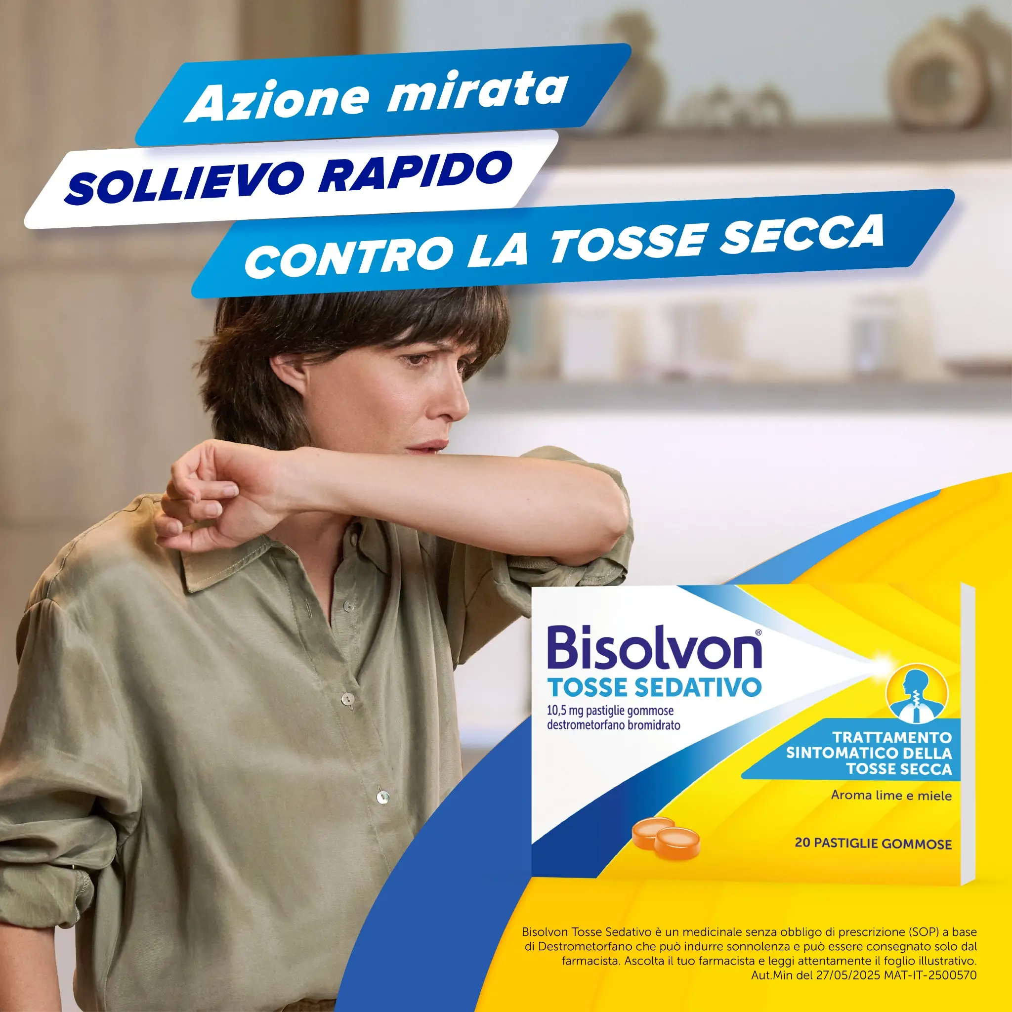 Per calmare la tosse secca (tosse non-produttiva) puoi provare Bisolvon® Tosse Sedativo pastiglie all’aroma di lime e miele, piacevoli da sciogliere in bocca. Grazie al loro formato, le puoi portare comodamente ovunque quando serve.