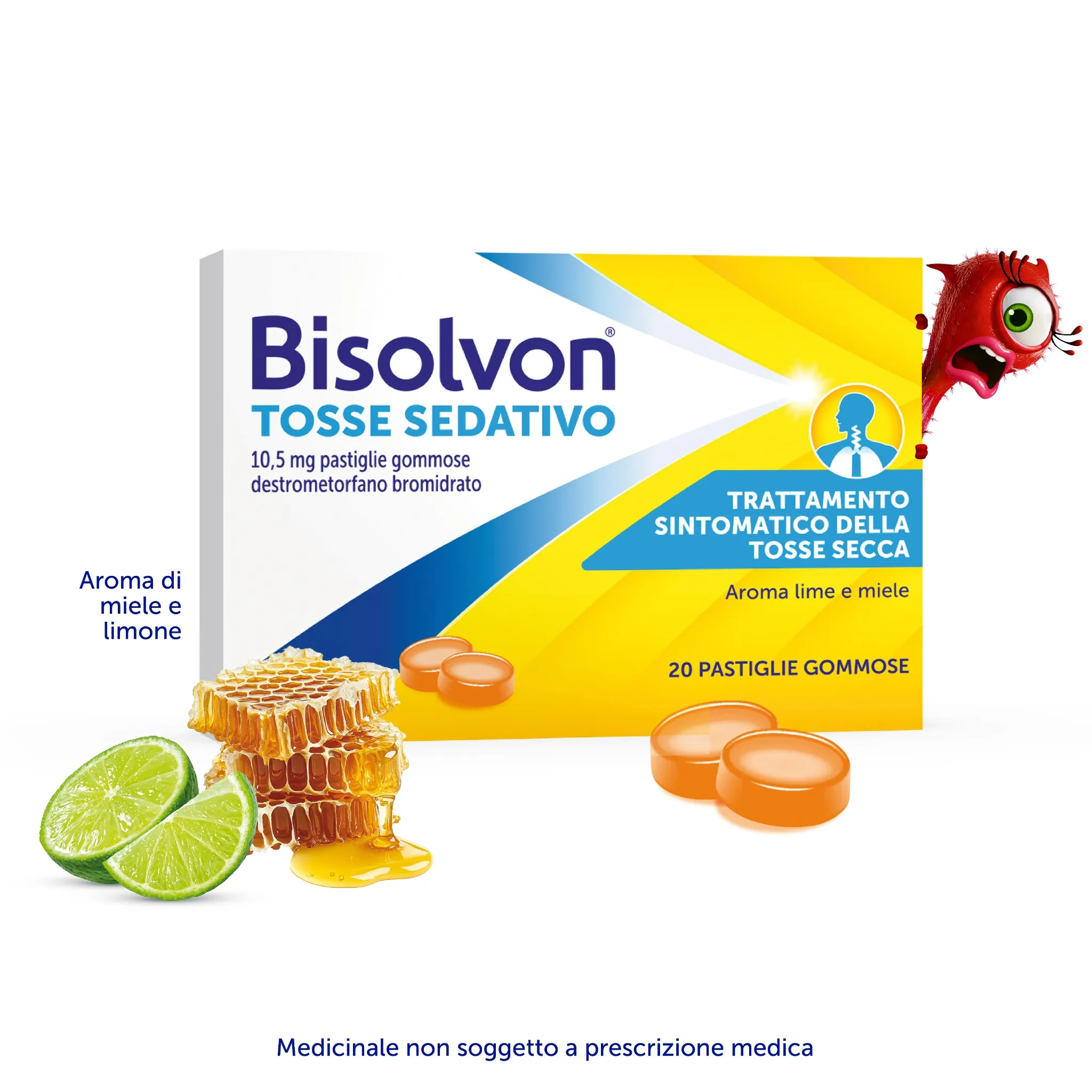Bisolvon® Tosse Sedativo pastiglie gommose contiene il principio attivo Destrometorfano Bromidrato, un sedativo della tosse che agisce quando serve riducendo lo stimolo a tossire.